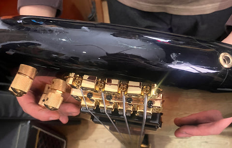 Body: sunburst finished maple veneer, some electrical tape to bottom edge where veneer is peeling, further peeling/cracking to cutaways; Neck: ...